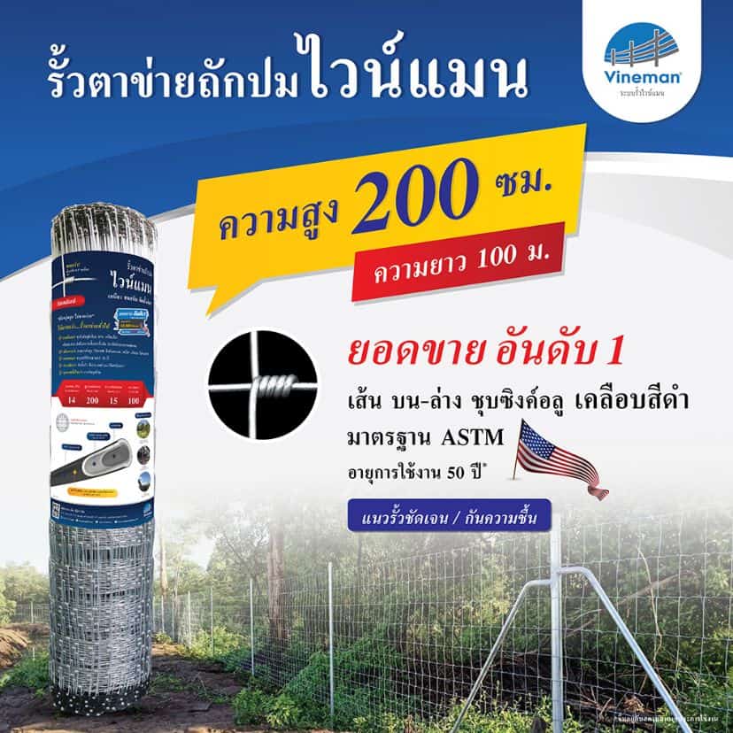 รั้วตาข่ายไวน์แมน รั้วตาข่ายถักปม – รุ่นความสูง 200 ซม.ลวดหนา 2.5 มม.(ยาว 50 เมตร) [อายุการใช้งาน 50 ปี*]