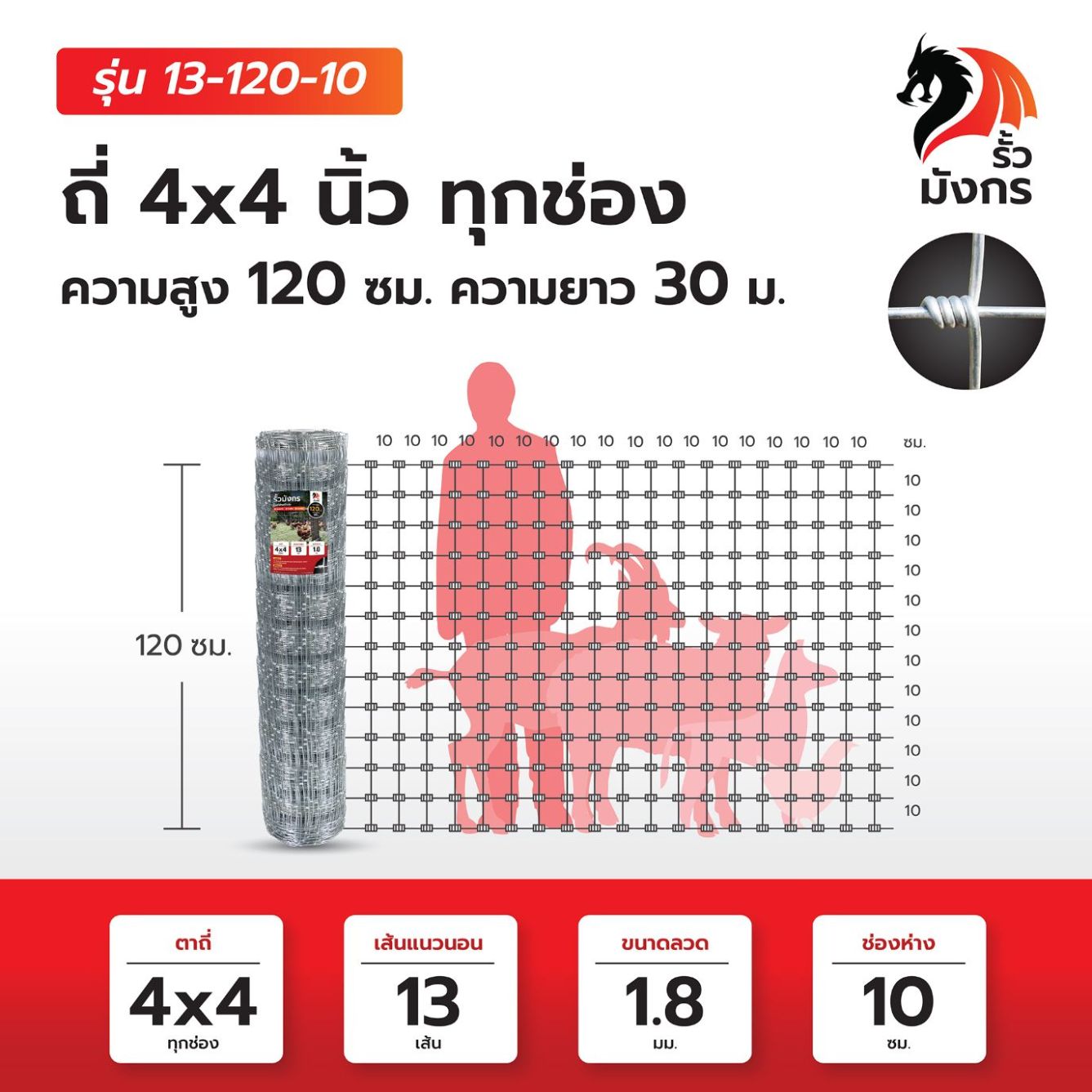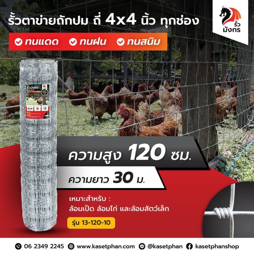 รั้วตาข่ายถักปม รั้วมังกร ถี่พิเศษ 4×4 นิ้ว เท่ากันทุกช่อง ความสูง 120 ซม. (ยาว 30 เมตร) หนา 1.8 มม. [อายุการใช้งาน 10 ปี*]