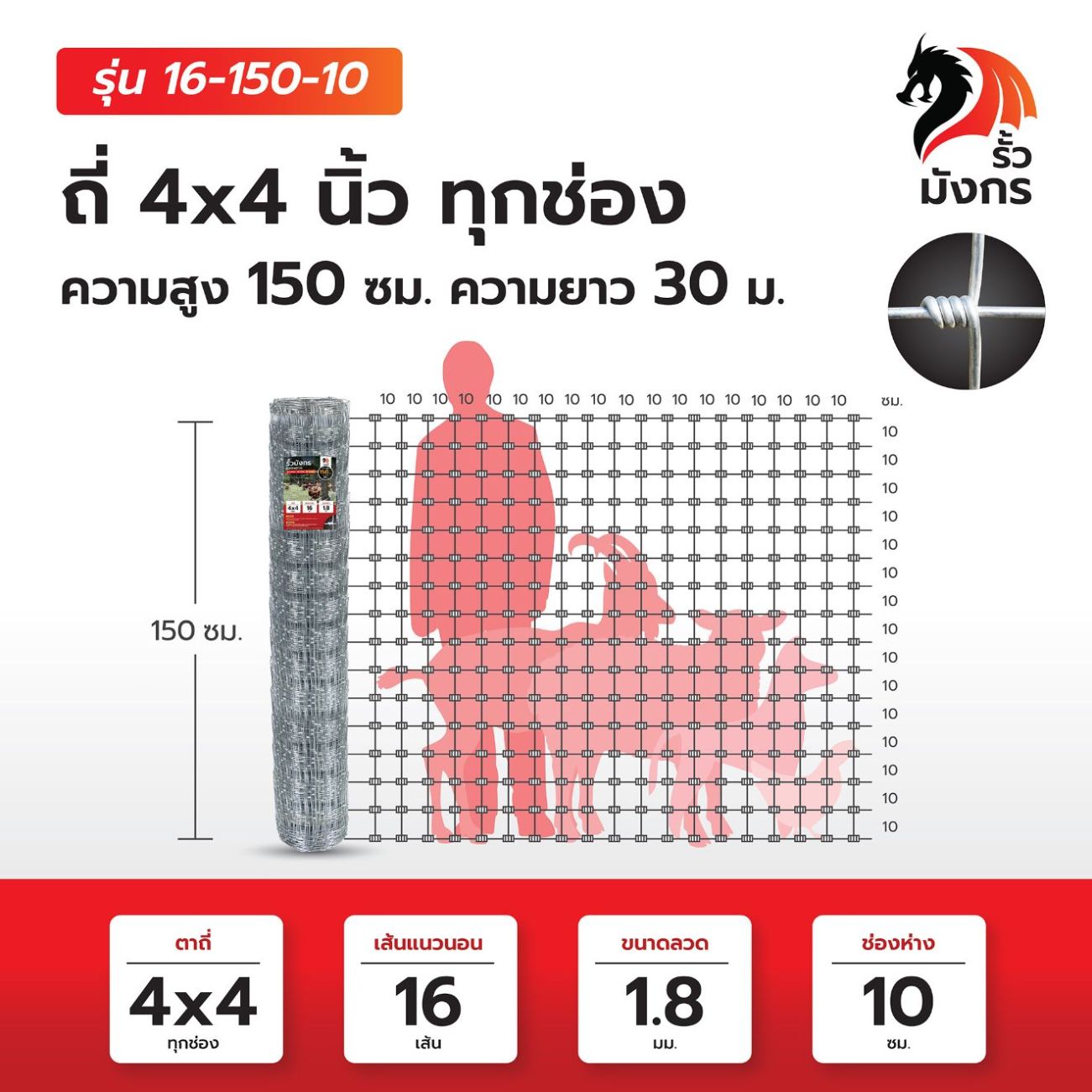 รั้วตาข่ายถักปม รั้วมังกร ถี่พิเศษ 4×4 นิ้ว เท่ากันทุกช่อง ความสูง 150 ซม. (ยาว 30 เมตร) ลวดหนา 1.8 มม. [อายุการใช้งาน 10 ปี*]