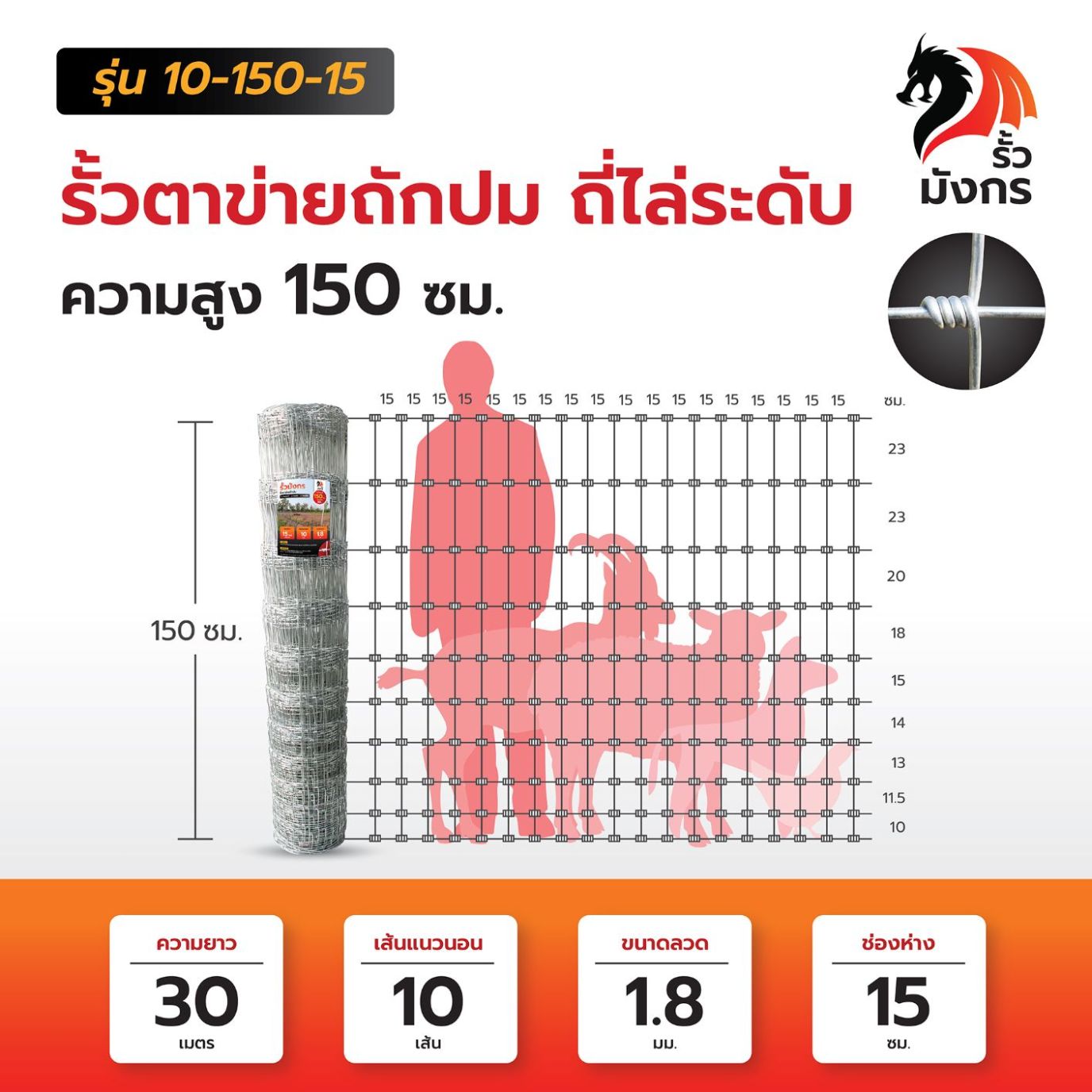 รั้วตาข่ายถักปม รั้วมังกร ถี่ไล่ระดับ ความสูง 150 ซม. (ยาว 30 เมตร) ลวดหนา 1.8 มม. [อายุการใช้งาน 10 ปี*]