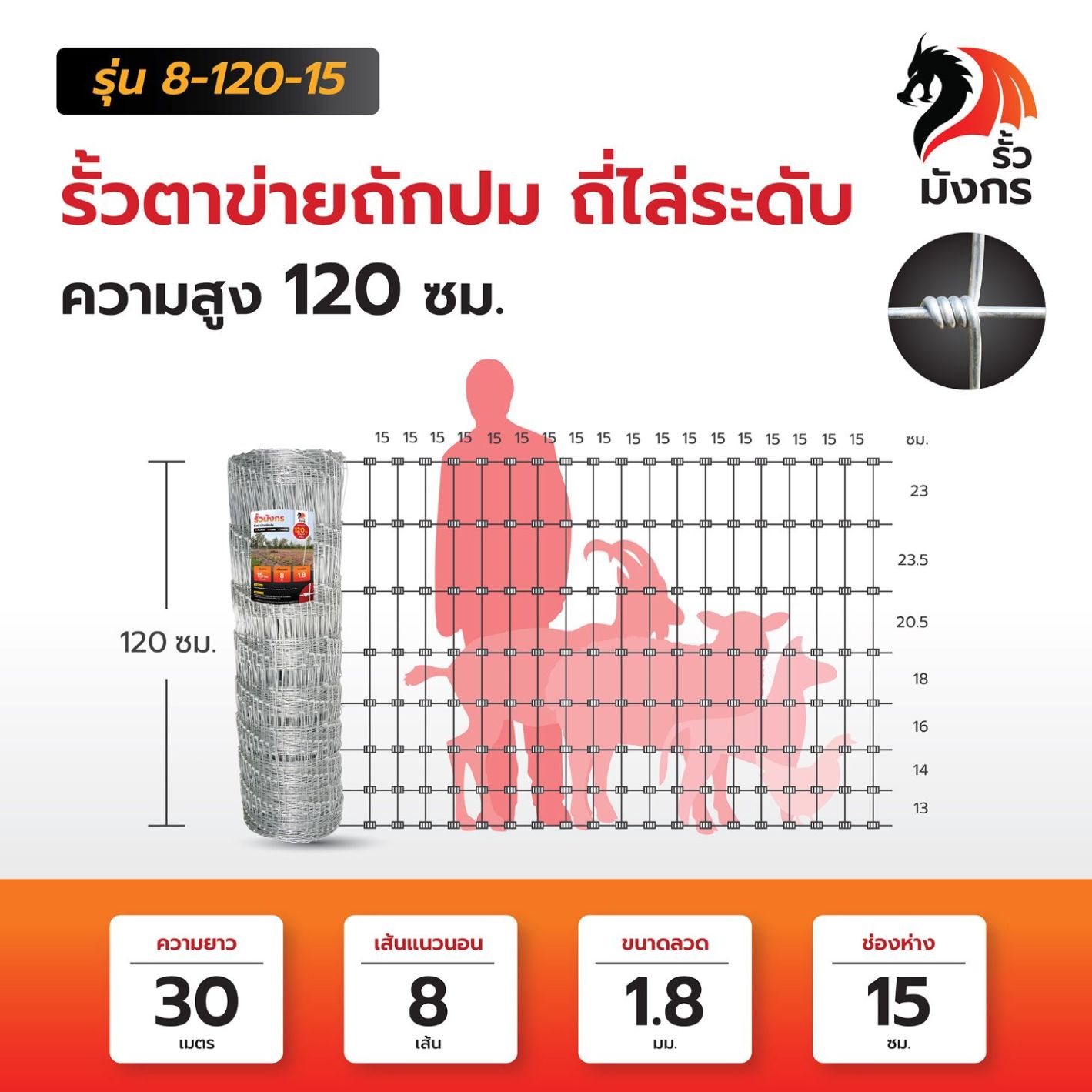 รั้วตาข่ายถักปม รั้วมังกร ถี่ไล่ระดับ ความสูง 120 ซม. (ยาว 30 เมตร) ลวดหนา 1.8 มม. [อายุการใช้งาน 10 ปี*]