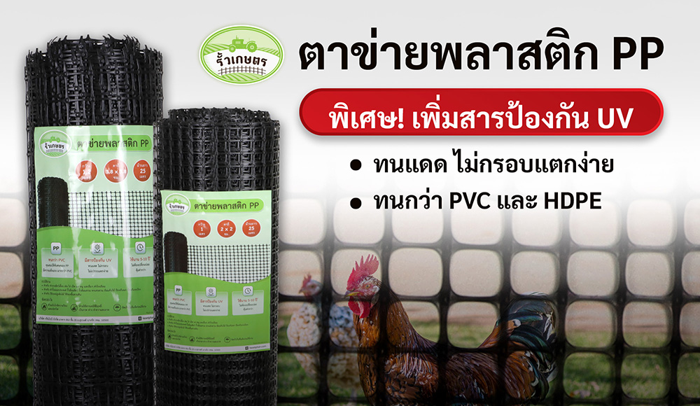 ตาข่ายพลาสติก PP อย่างหนา เหนียวกว่า ทนแดน ทนฝน ไม่กรอบแตกง่าย ไม่ต้องเปลี่ยนบ่อยๆ ดีกว่า PVC และ PE ด้วยคุณสมบัติที่ทนความร้อนและทนรังสี UV สูงกว่า (PP เป็นวัสดุเดียวกับถุงร้อน แก้วกาแฟ และกล่องอาหารที่เข้าไมโครเวฟได้)