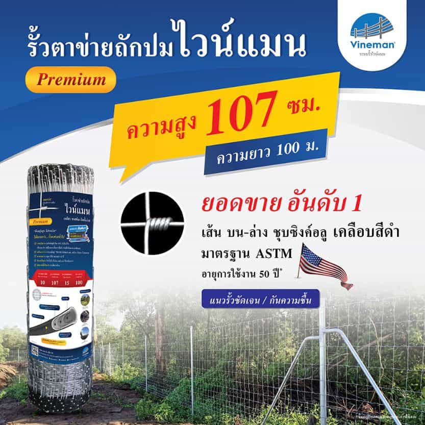 รั้วตาข่ายไวน์แมน รั้วตาข่ายถักปม – รุ่นความสูง 107 ซม. พรีเมี่ยม (ยาว 100 เมตร) [อายุการใช้งาน 80 ปี*]