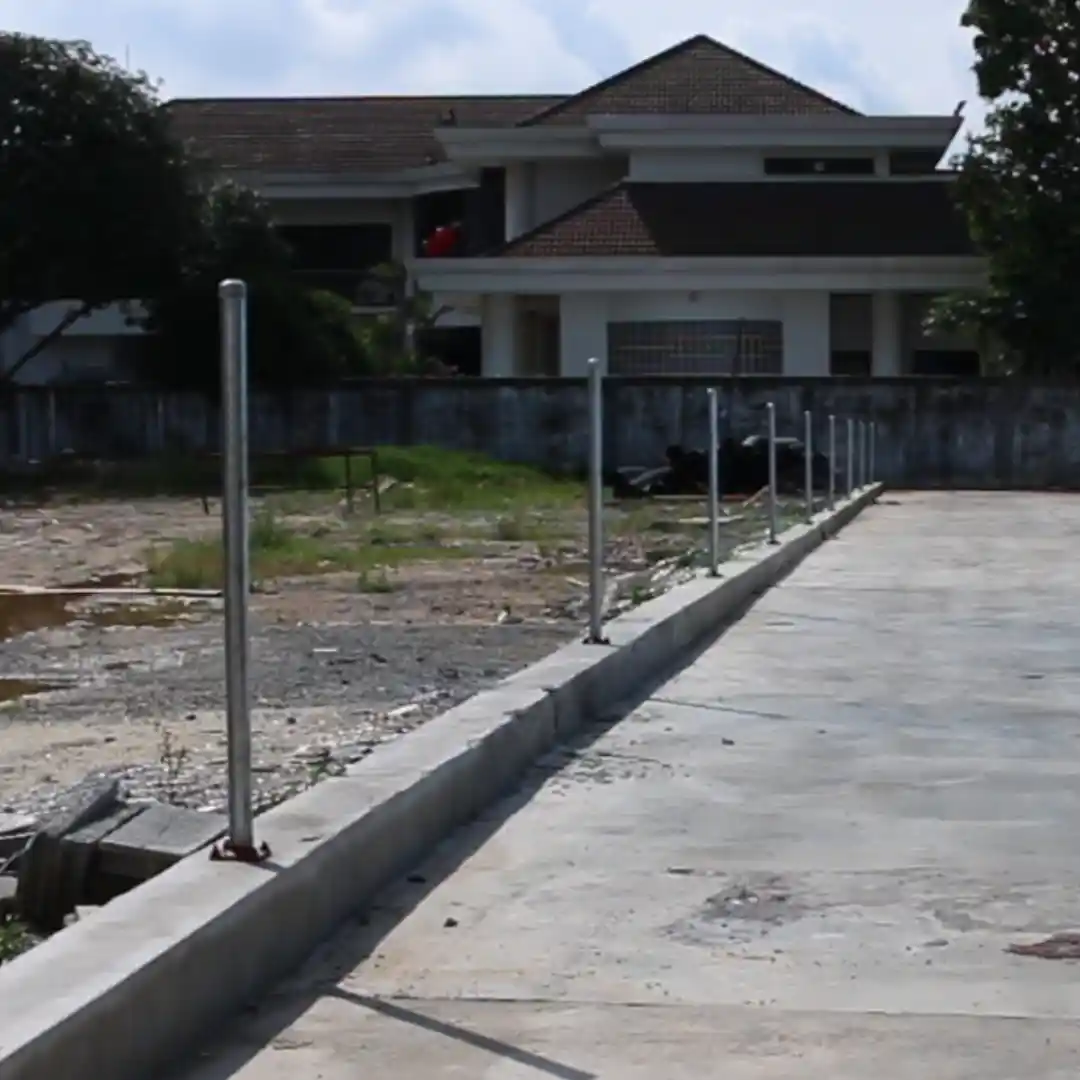 ขุดหลุมเทปูนตั้งสาให้แข็งแรง โดยเฉพาะเสาต้นแรก/ต้นสุดท้าย ต้องแข็งแรงและมีตัวค้ำยันระยะห่างของเสาย่อย 3 เมตร ระยะห่างของเสาหลัก (มีตัวค้ำยัน) 50 เมตร/ต้น