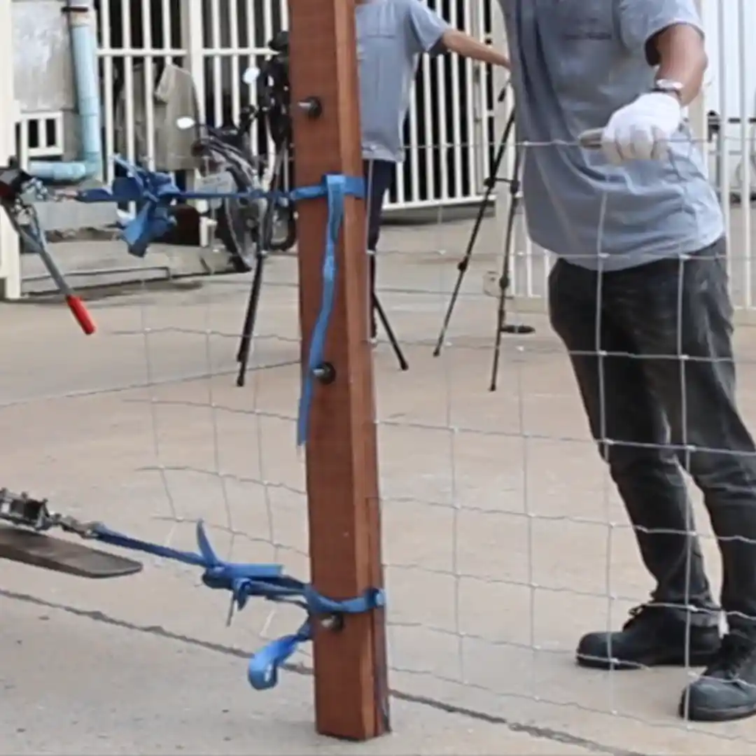 ดึงตาข่ายให้ตึง โดยใช้รอกสลิงมือโยก หรือเครื่องทุ่นแรงอื่น ๆ เป็นตัวช่วย เนื่องจากถ้าใช้แรงคน อาจจะทำให้ตาข่ายไม่ตึงเท่าที่ควร ก่อนที่จะผูกกับเสาต้นสุดท้ายให้แน่น เพื่อช่วยให้รั้วตาข่ายมีความแข็งแรงทนต่อการกระแทก และสามารถสปริงตัวได้
